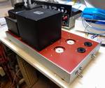 初段と位相反転の球をmT管からGT管に変更したくらいで、大幅な変更はないが、横向きの状態で使うように穴あけをしていたのを、縦向きに変更したため写真を見ればわかるように、すでにあけていた穴を目隠しするようにパネルを取り付けた。自画自賛になってしまうが、なかなかカッコ良いアンプになりそうである。